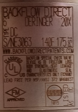 Earlier this year an article and picture was posted showing a Backflow Direct Derringer 20X Double Check Valve that had a slightly altered identification tag. As the National Sales Manager for Backflow Direct, I would like to take this opportunity to provide some information on this situation and show that this issue has been resolved.